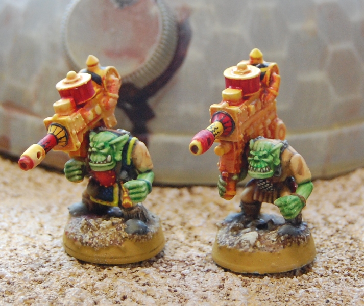 These guys look great! I love these old wonky looking orks. I used to have one of those old heavy weapon orks, he he. The painting looks great too, really capturing that 2nd edition flair!