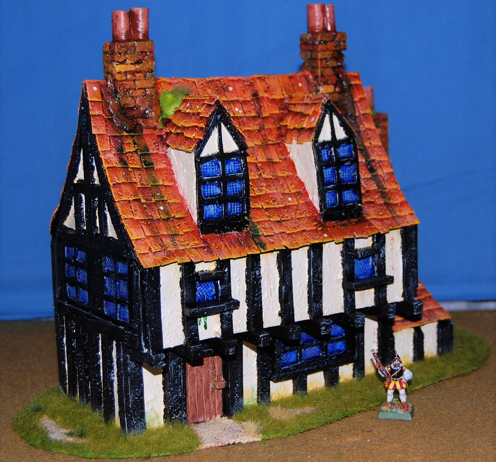 I also think that next time I would use thick card instead of balsa wood for the timbering, as the balsa is too thick and stands proud of the plasterwork by no small amount. It makes the house look more like a modern mock-Tudor (where the timbering is purely decorative) when on a real Tudor house the timbering would be flush with the plasterwork as the timber was actually load-bearing and part of the walls (some pictures below illustrate what I mean).