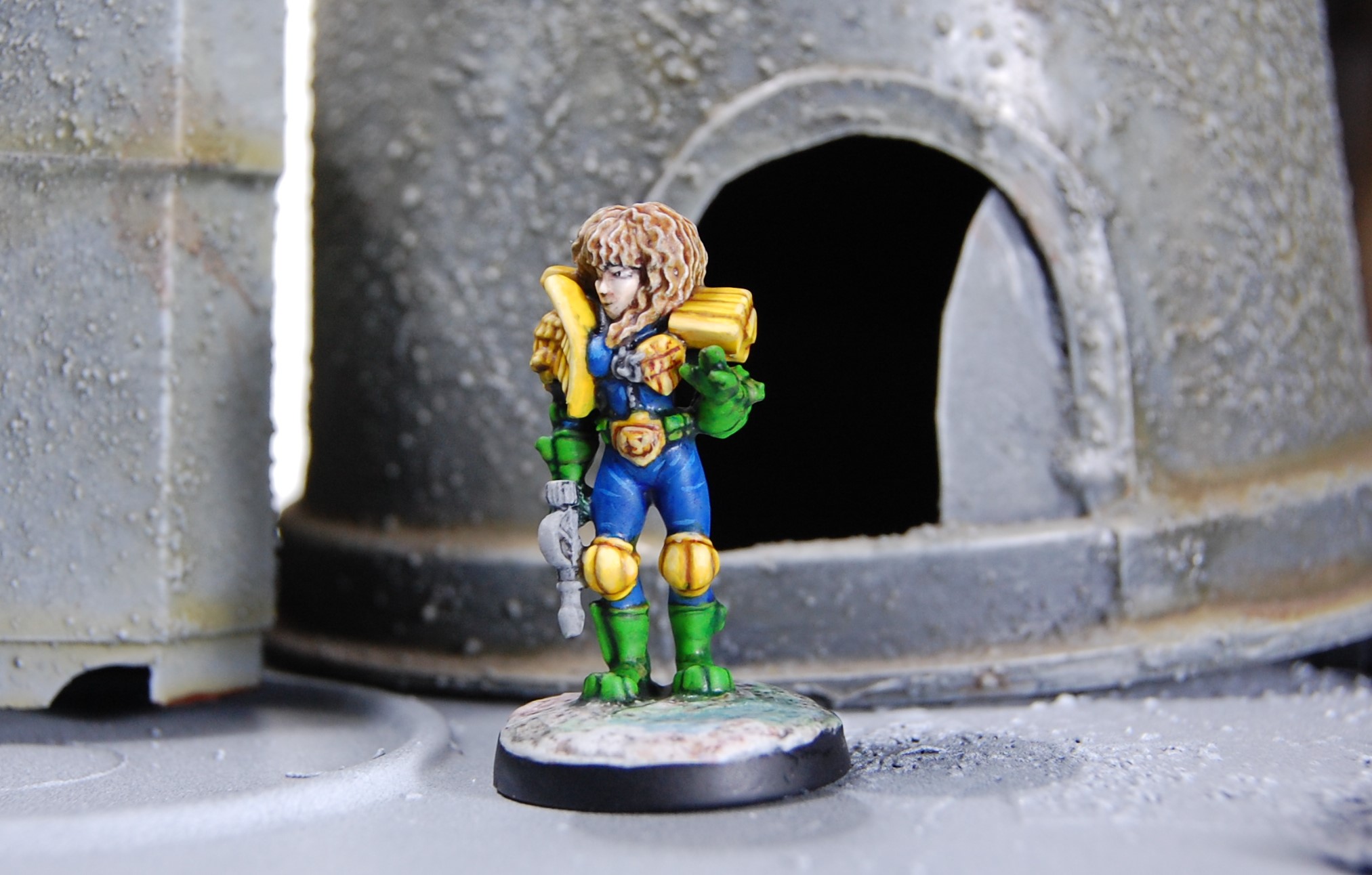 Most recently off the painting bench is this 2000AD Psi-Judge Karyn made by Foundry. I don’t really know much about Judge Karynย as such, but I painted her as a gift for my wife (hence the blonde, instead of whatever colour hair Karyn may actually have… the official Kevin Dallimore paintjob has it as red).